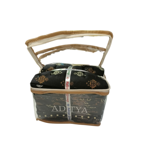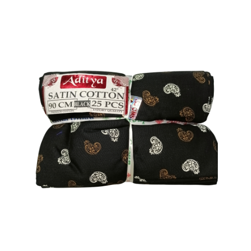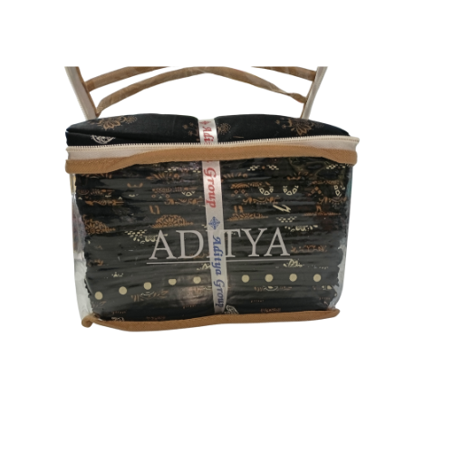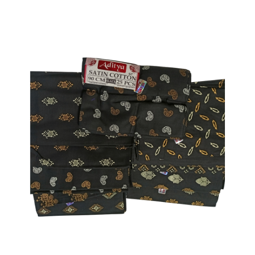 Elegant Aditya Black blouse fabric crafted with satin-finish cotton. Features a black base enhanced with golden and white designs in multiple motifs. Durable, smooth, and versatile — perfect for matching with sarees for festive, casual, and formal occasions.