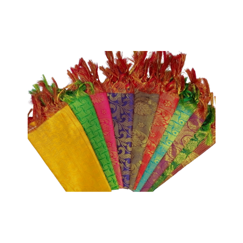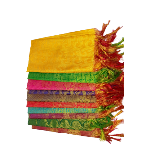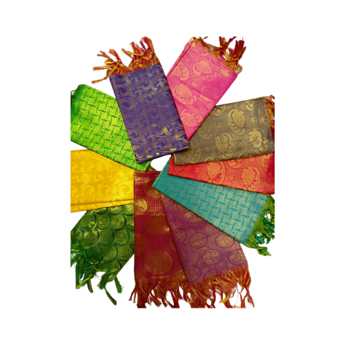 ElegantΒ traditional Ponnadai made with soft lightweight fabric. Comes in vibrant base colors with golden woven designs and tassel edges. Ideal for honoring guests, gifting, and cultural ceremonies.