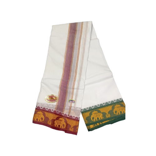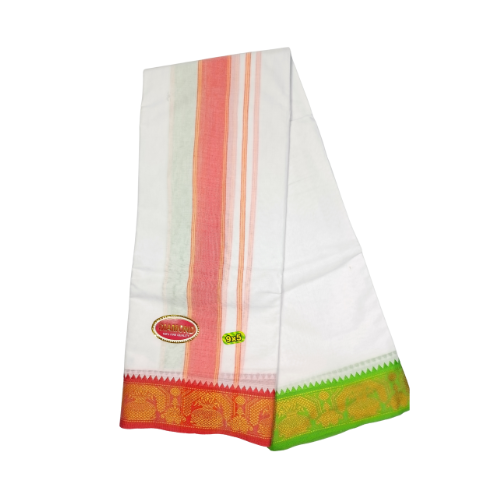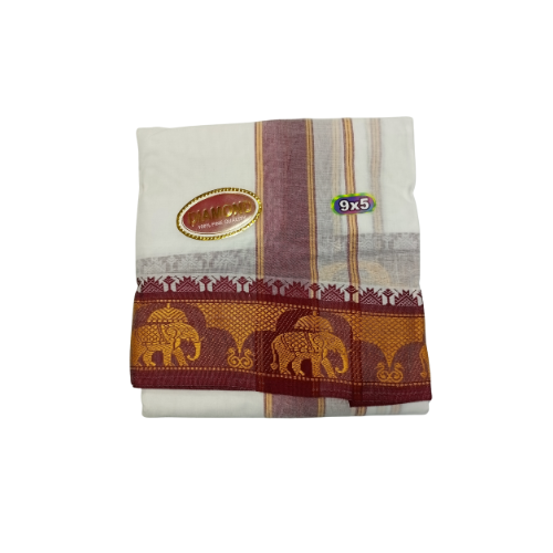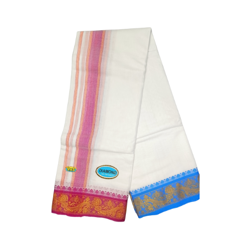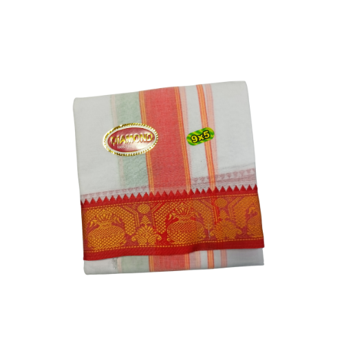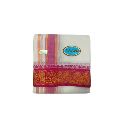 The 14 Molam Sami Vesti Diamond (9×5) is a luxurious devotional dhoti with a diamond Jaquard finish. Known for its premium weaving and traditional style, it is best suited for festivals, deity alankaram, and auspicious occasions.